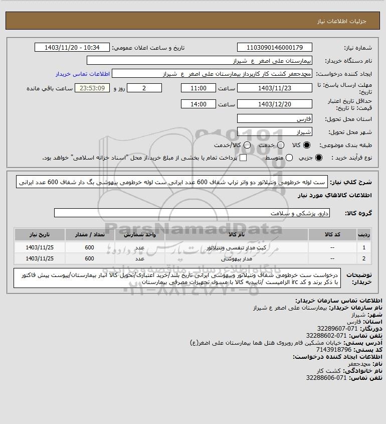 توضیحات خریدار:درخواست ست خرطومی شفاف ونتیلاتور وبیهوشی ایرانی تاریخ بلند/خرید اعتباری/تحویل کالا انبار بیمارستان/پیوست پیش فاکتور با ذکر برند و کد irc الزامیست /تاییدیه کالا با مسول تجهیزات مصرفی بیمارستان