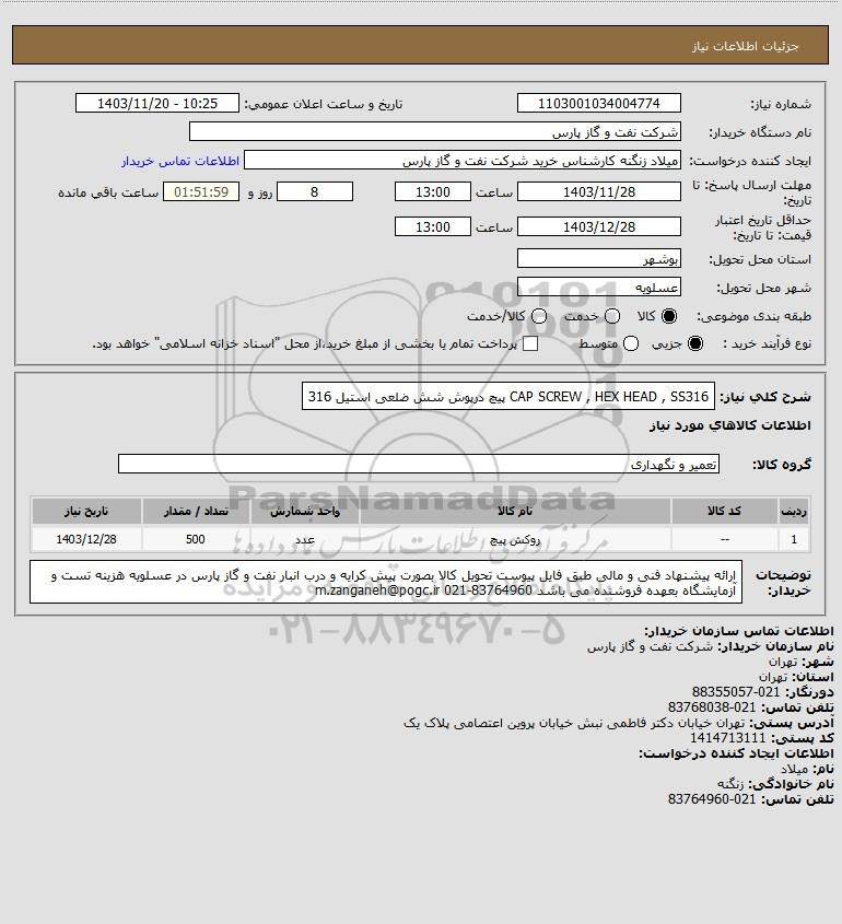 شرح کلی نیاز: CAP SCREW , HEX HEAD , SS316