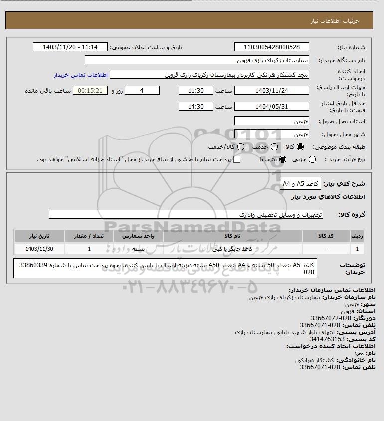 نام سازمان خریدار: بیمارستان زکریای رازی قزوین