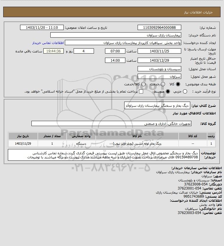 شرح کلی نیاز: دیگ بخار و سختگیر بیمارستان رازی سراوان