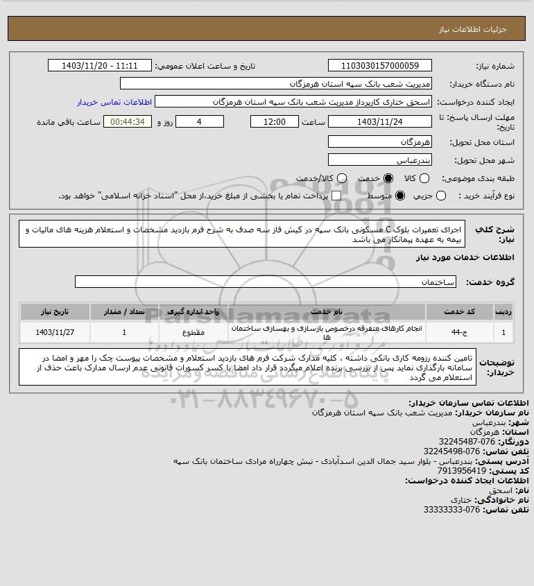 شرح کلی نیاز: اجرای تعمیرات بلوک C مسکونی بانک سپه در کیش فاز سه صدف به شرح فرم بازدید مشخصات و استعلام هزینه های مالیات و بیمه به عهده پیمانکار می باشد