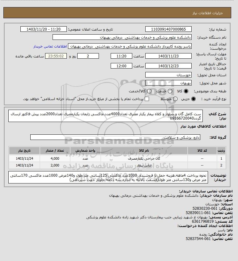 شرح کلی نیاز: ست کامل گان و شلوار و کلاه بیمار یکبار مصرف تعداد4000عدد.ماکسی زایمان یکبارمصرف تعداد2000عدد پیش فاکتور ارسال گردد09166720040