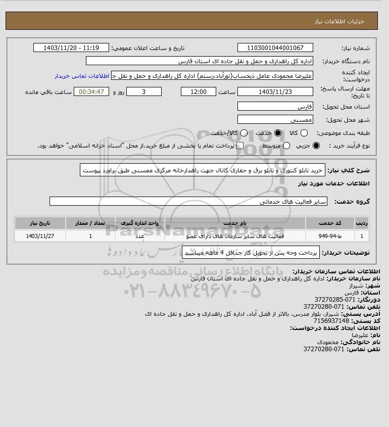شرح کلی نیاز: خرید تابلو کنتوری و تابلو برق و حفاری کانال جهت راهدارخانه مرکزی ممسنی طبق براورد پیوست