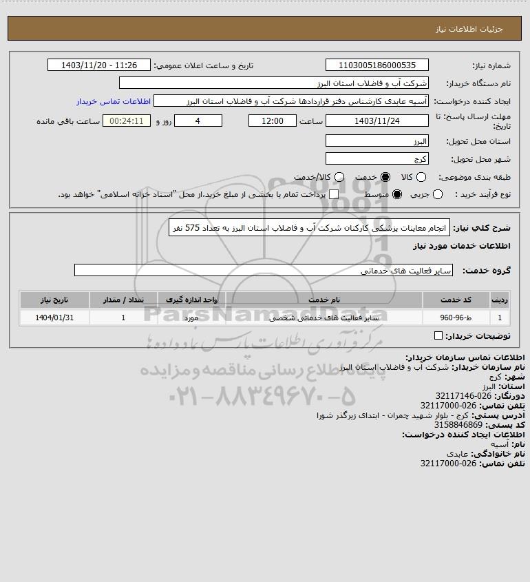 شرح کلی نیاز: انجام معاینات پزشکی کارکنان شرکت آب و فاضلاب استان البرز به تعداد 575 نفر