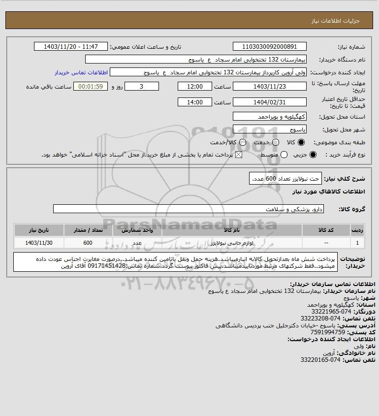 نام سازمان خریدار: بیمارستان 132 تختخوابی امام سجاد ع یاسوج