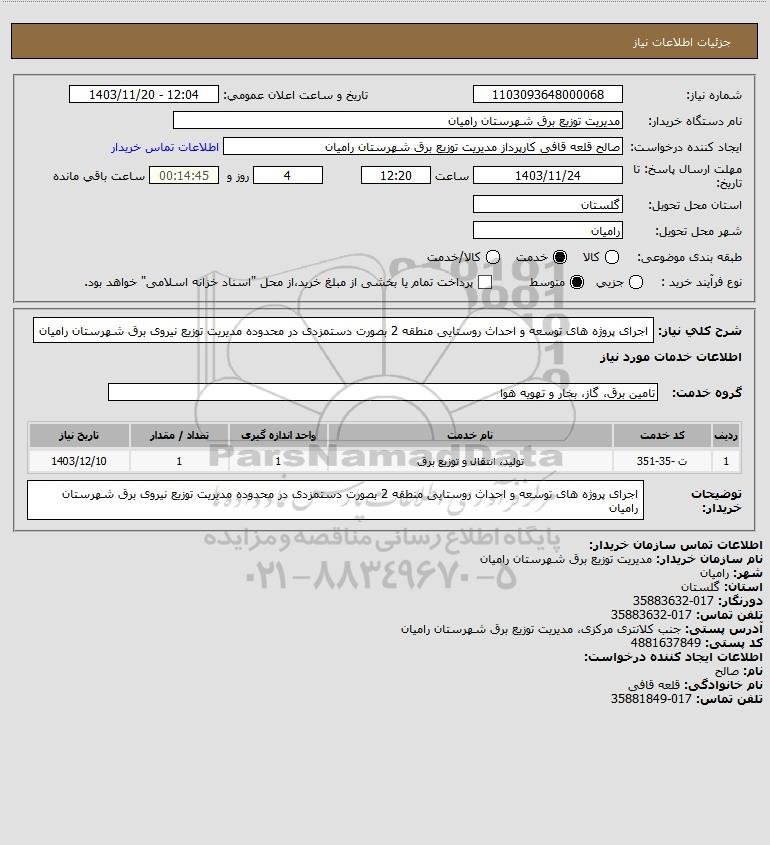 شرح کلی نیاز: اجرای پروژه های توسعه و احداث روستایی منطقه 2 بصورت دستمزدی در محدوده مدیریت توزیع نیروی برق شهرستان رامیان