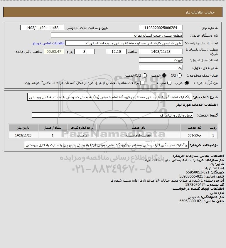 شرح کلی نیاز: واگذاری نمایندگی قبول پستی مستقر در فرودگاه امام خمینی (ره) به بخش خصوصی با عنایت به فایل پیوستی