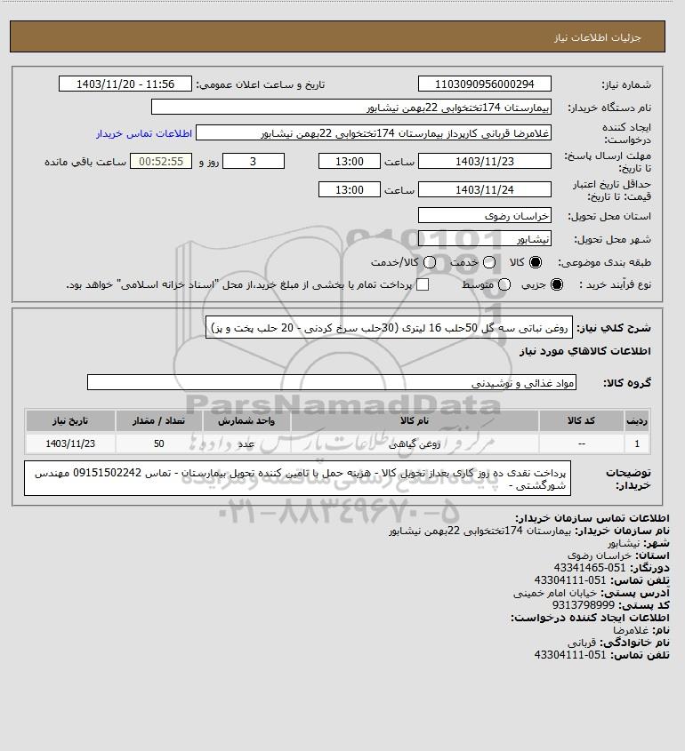 شرح کلی نیاز: روغن نباتی سه گل 50حلب 16 لیتری (30حلب سرخ کردنی - 20 حلب پخت و پز)