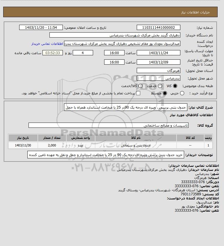 شرح کلی نیاز: جدول بتنی پرسی ، ویبره ای درجه یک 90در 25 با ضخامت استاندارد همراه با حمل