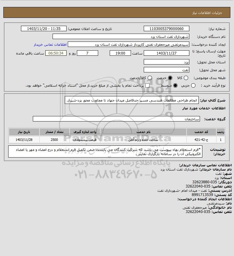 استعلام انجام طراحی مطالعات هندسی مسیر حدفاصل میدان جهاد تا مجاورت محور یزد-شیراز., استعلام انجام طراحی مطالعات هندسی مسیر حدفاصل میدان جهاد تا مجاورت محور یزد-شیراز.