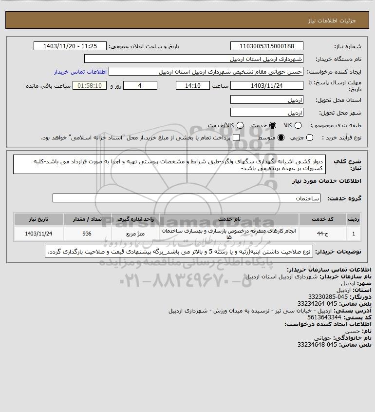 استعلام بها و موضوع استعلام استعلام دیوار کشی اشیانه نگهداری سگهای ولگرد-طبق شرایط و مشخصات پیوستی تهیه و اجرا به صورت قرارداد می باشد-کلیه کسورات بر عهده برنده می باشد- به اطلاع کلیه شرکتها و افراد متخصص واجد شرایط میرساند، آگهی گذار در نظر دارد از طریق استعلام بها، نسبت به انتخاب و دریافت پیشنهادات اقدام نماید. این استعلام با کد آگهی ثبت شده در سامانه خبرگزاری پارس نماد : 8652337 منتشر شده است. مشخصات استعلام : تاریخ شروع استعلام: 1403/11/20 آخرین مهلت ارسال پیشنهاد قیمت : 1403/11/24 و محل اجرای پروژه : استان اردبیل میباشد. استعلام قیمت مورد درخواست : استعلام دیوار کشی اشیانه نگهداری سگهای ولگرد-طبق شرایط و مشخصات پیوستی تهیه و اجرا به صورت قرارداد می باشد-کلیه کسورات بر عهده برنده می باشد- با دستهبندیهای تخصصی و گروه های مرتبط : ساختمان, استعلام اطلاع رسانی میگردد.