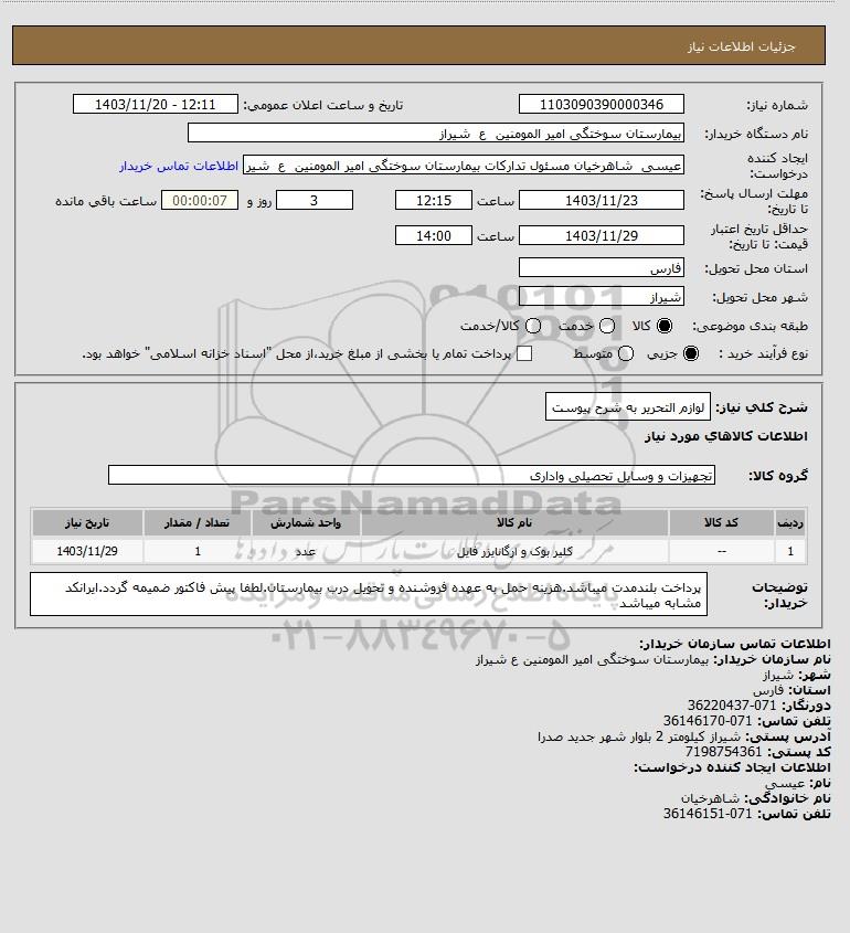 شرح کلی نیاز: لوازم التحریر به شرح پیوست