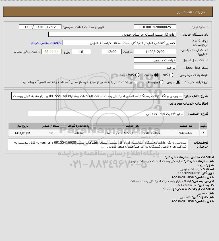شرح کلی نیاز: سرویس و نگه دارای دوستگاه آسانسور اداره کل پست استان /اطلاعات بیشتر09155416038 و مراجعه به فایل پیوست