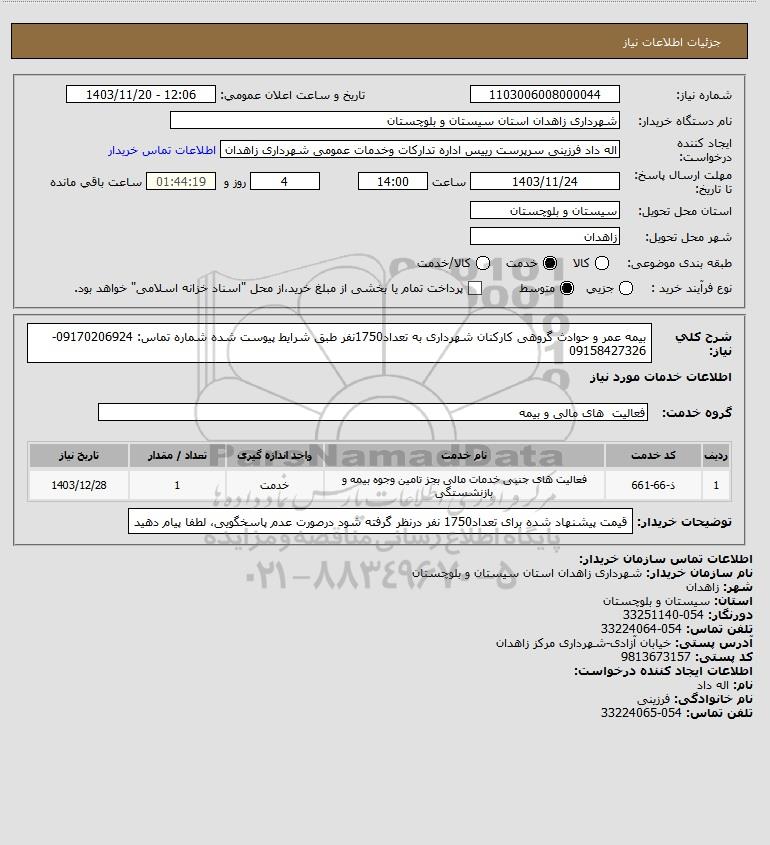 شرح کلی نیاز: بیمه عمر و حوادث گروهی کارکنان شهرداری به تعداد1750نفر طبق شرایط پیوست شده