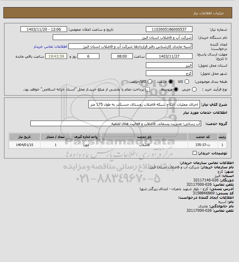 شرح کلی نیاز: اجرای عملیات اصلاح شبکه فاضلاب روستای حسنکدر به طول 175 متر