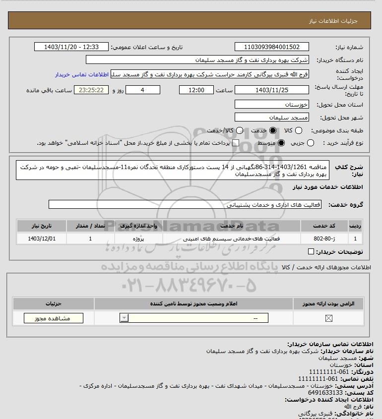 شرح کلی نیاز: مناقصه 1403/1261-314-86نگهبانی از 14 پست دستورکاری منطقه تحدگان نمره11-مسجدسلیمان -تمبی و حومه در شرکت بهره برداری نفت و گاز مسجدسلیمان