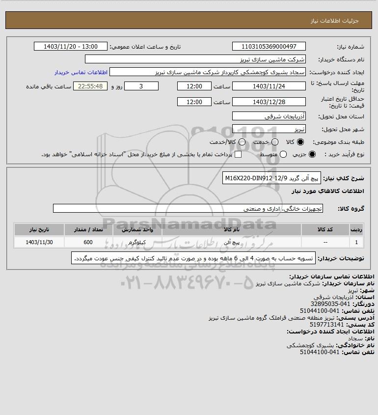 شرح کلی نیاز: پیچ آلن گرید 12/9