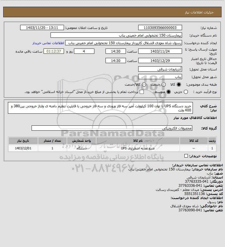 | 1 | -- | منبع تغذیه اضطراری UPS | دستگاه | 1 | 1403/12/01 |