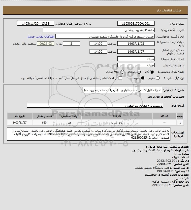 | 1 | -- | کابل قدرت | متر | 650 | 1403/11/27 |
