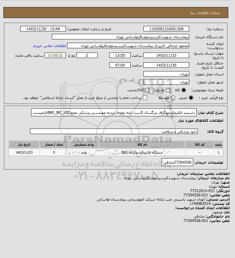 استعلام دستبند الکتروکاردیوگراف بزرگسال 5ست ارایه نمونه تاییدیه مهندسی پزشکی مجوزIMD_IRC_UIDالزامیست, استعلام دستبند الکتروکاردیوگراف بزرگسال 5ست ارایه نمونه تاییدیه مهندسی پزشکی مجوزIMD_IRC_UIDالزامیست