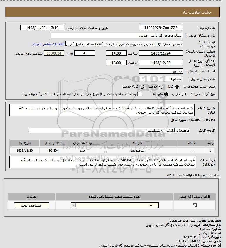 شرح کلی نیاز: خرید تعداد 25 آیتم اقلام تنظیفاتی به مقدار 50504 عدد طبق توضیحات فایل پیوست - تحویل درب انبار خریدار استراحتگاه بیدخون شرکت مجتمع گاز پارس جنوبی
