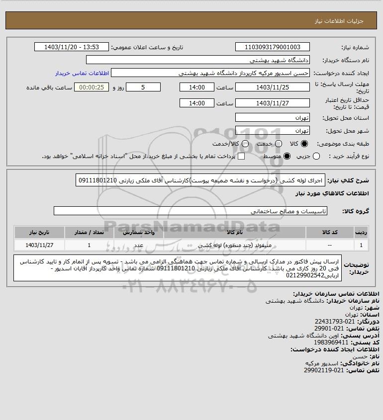 شرح کلی نیاز: اجرای لوله کشی (درخواست و نقشه ضمیمه پیوست)کارشناس آقای ملکی زیارتی 09111801210