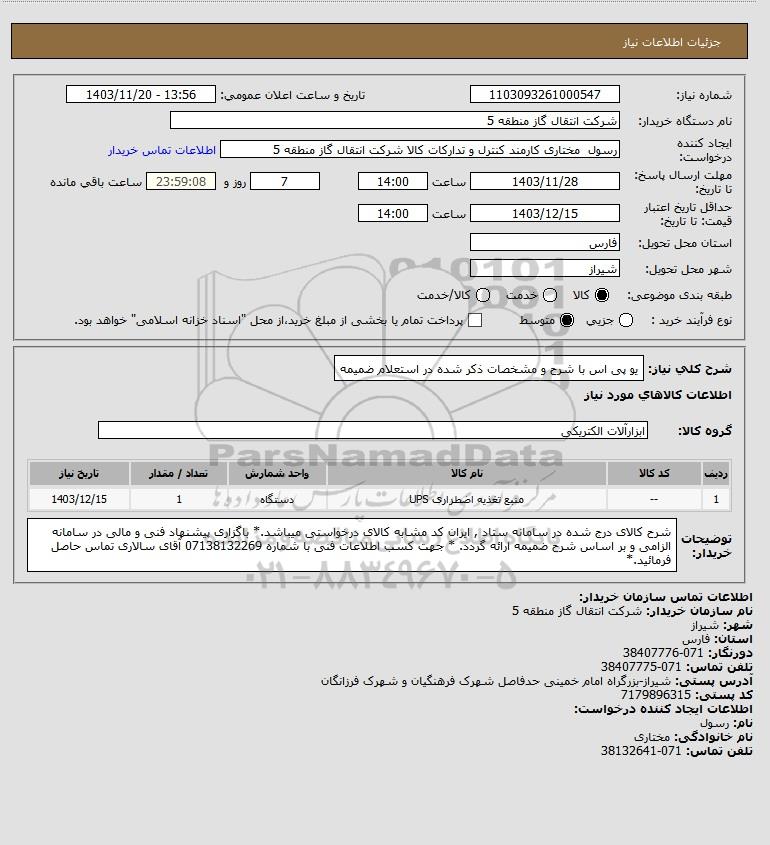 شرح کلی نیاز: یو پی اس با شرح و مشخصات ذکر شده در استعلام ضمیمه