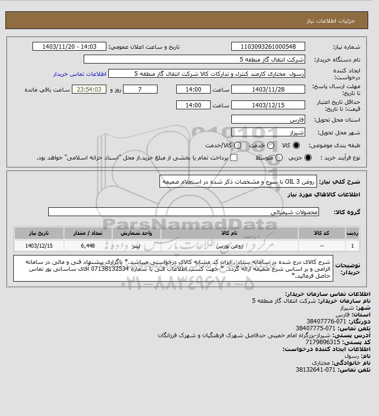 شرح کلی نیاز: روغن OIL 3 با شرح و مشخصات ذکر شده در استعلام ضمیمه