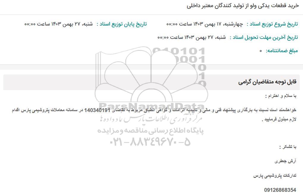 با سلام و احترام : خواهشمند است نسبت به بارگذاری پیشنهاد فنی و مالی و تاییدیه الزامات و گواهی انطباق مربوط به تقاضای 140340191در سامانه معاملات پتروشیمی پارس اقدام لازم مبذول فرمایید .