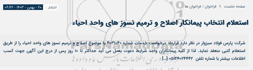 شرکت پارس فولاد سبزوار در نظر دارد قرارداد درخواست خدمات شماره 4031040 با موضوع اصلاح و ترمیم نسوزهای واحد احیاء را از طریق استعلام کتبی منعقد نماید لذا از کلیه پیمانکاران واجد شرایط دعوت بعمل می آید حداکثر تا 10 روز پس از درج این آگهی جهت کسب اطلاعات بیشتر با شماره تلفن 05144024442 [...]