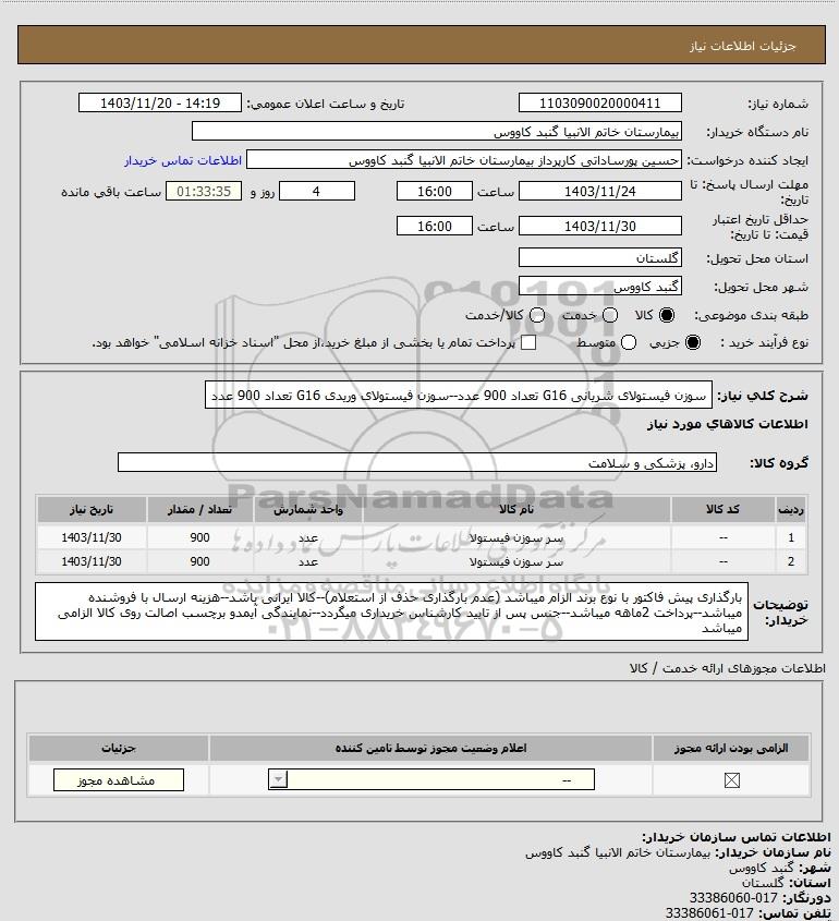 شرح کلی نیاز: سوزن فیستولای شریانی G16 تعداد 900 عدد--سوزن فیستولای وریدی G16 تعداد 900 عدد