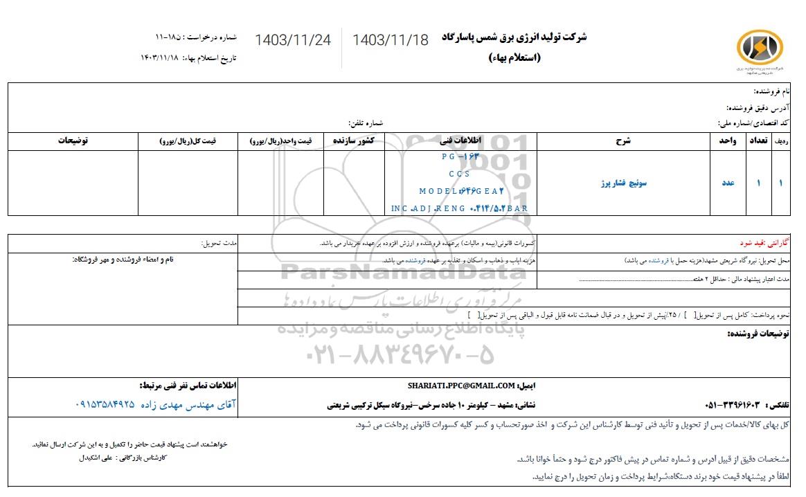 استعلام بها و موضوع استعلام استعلام سوئیچ فشار پرژ به اطلاع کلیه شرکتها و افراد متخصص واجد شرایط میرساند، آگهی گذار در نظر دارد از طریق استعلام بها، نسبت به انتخاب و دریافت پیشنهادات اقدام نماید. این استعلام با کد آگهی ثبت شده در سامانه خبرگزاری پارس نماد : 8653056 منتشر شده است. مشخصات استعلام : تاریخ شروع استعلام: 1403/11/20 آخرین مهلت ارسال پیشنهاد قیمت : 1403/11/24 و محل اجرای پروژه : استان خراسان رضوی میباشد. استعلام قیمت مورد درخواست : استعلام سوئیچ فشار پرژ با دستهبندیهای تخصصی و گروه های مرتبط : ابزار دقیق, انواع کلید و پریزهای برقی و صنعتی, نیروگاه, تجهیزات برق و الکترونیک, استعلام اطلاع رسانی میگردد.