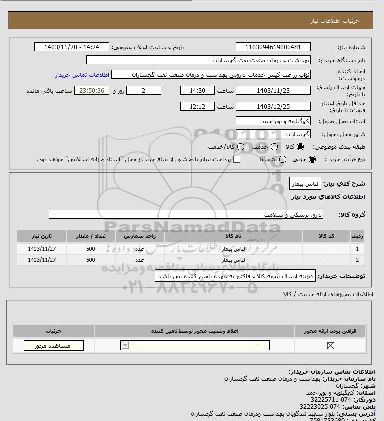 | 2 | -- | لباس بیمار | عدد | 500 | 1403/11/27 |