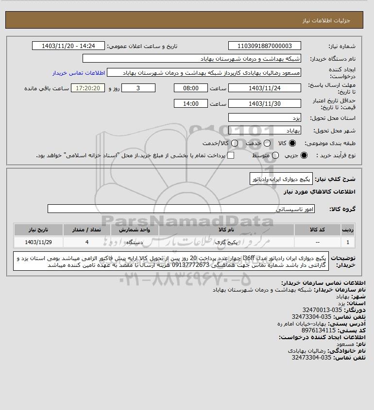 شرح کلی نیاز: پکیچ دیواری ایران رادیاتور
