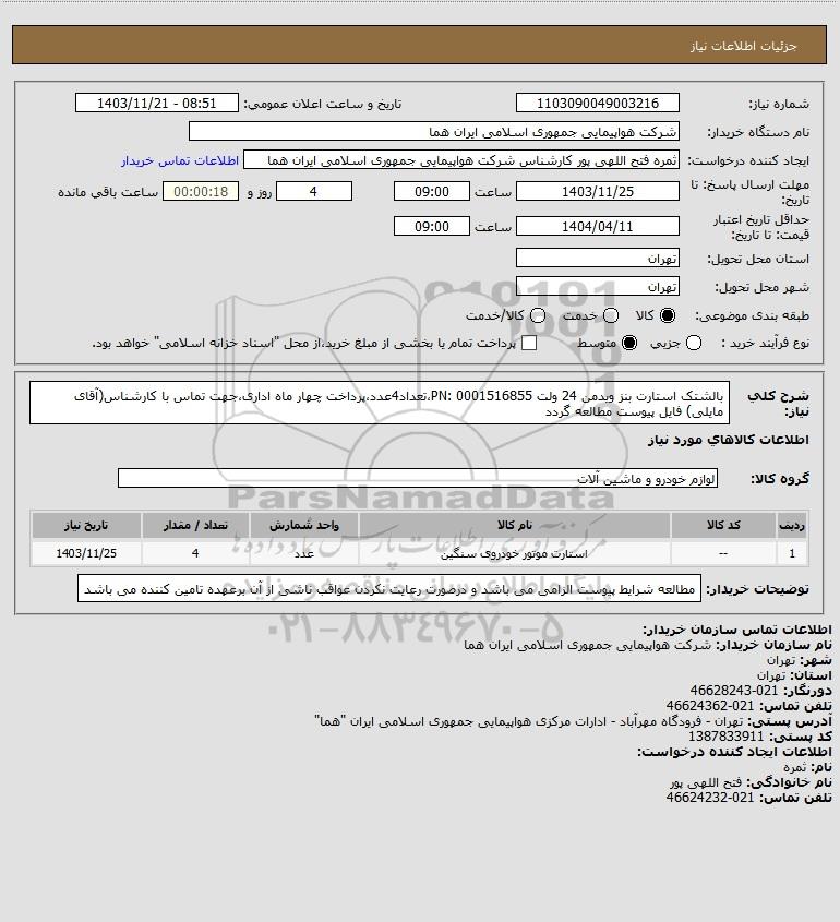 | 1 | -- | استارت موتور خودروی سنگین | عدد | 4 | 1403/11/25 |