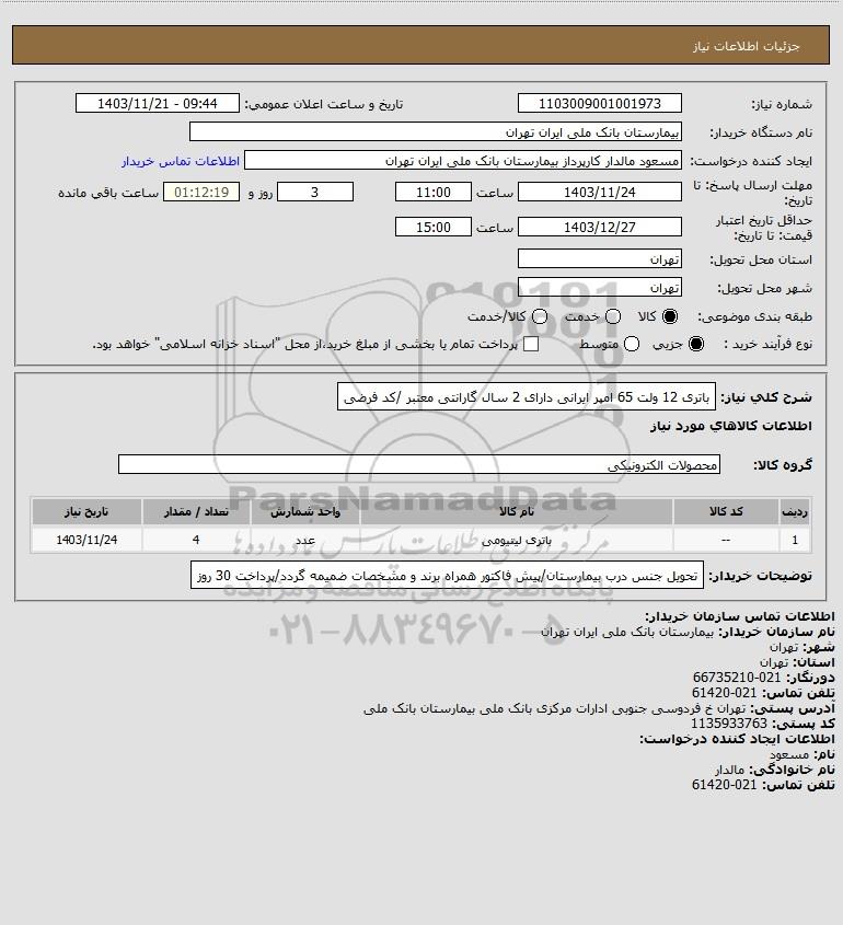 شرح کلی نیاز: باتری 12 ولت 65 امپر ایرانی دارای 2 سال گارانتی معتبر /کد فرضی
