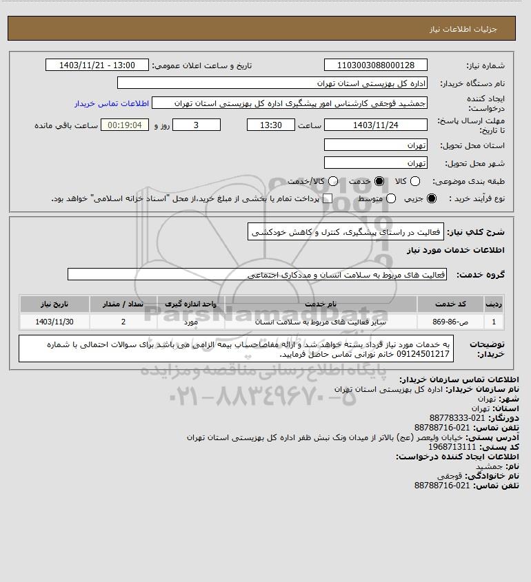 شرح کلی نیاز: فعالیت در راستای پیشگیری، کنترل و کاهش خودکشی