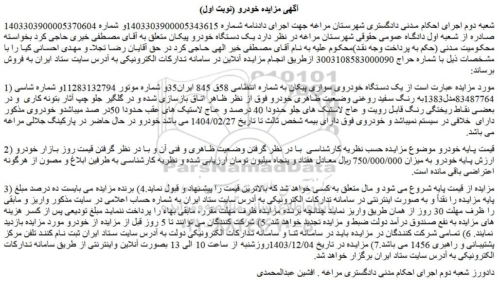 شعبه دوم اجرای احکام مدنی دادگستری شهرستان مراغه جهت اجرای دادنامه شماره 1403303900005343615و شماره 1403303900005370604 صادره از شعبه اول دادگاه عمومی حقوقی شهرستان مراغه در نظر دارد یک دستگاه خودرو پیکان متعلق به آقای مصطفی خیری حاجی کرد بخواسته محکومیت مدنی (حکم به پرداخت وجه نقد)محکوم علیه به نام آقای مصطفی خیر الهی حاجی کرد در حق آقایان رضا تجلا و مهدی احسانی کیا را با مشخصات ذیل با شماره حراج 3003108583000090 ازطریق انجام مزایده آنلاین در سامانه تدارکات الکترونیکی به آدرس سایت ستاد ایران به فروش برساند: