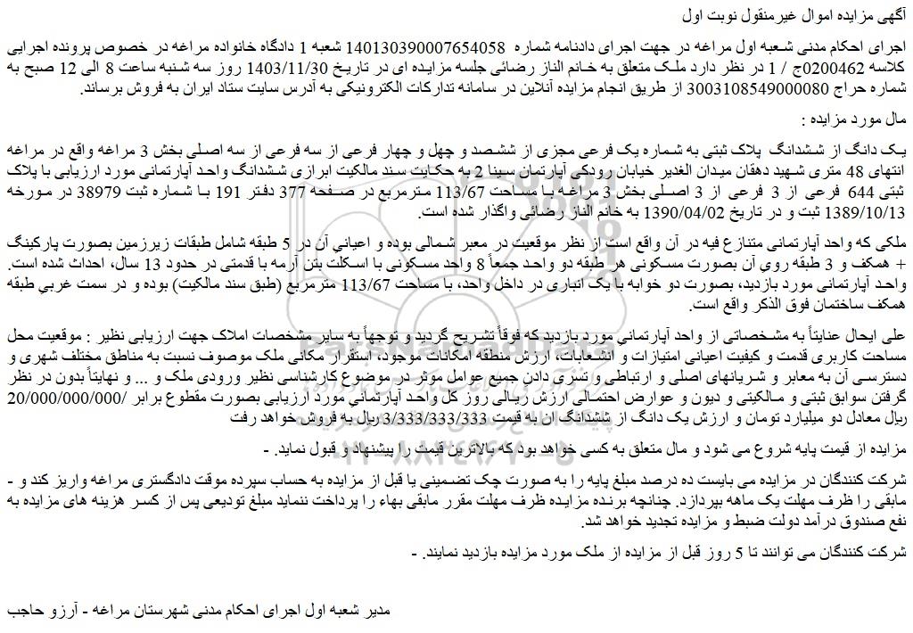 اجرای احکام مدنی شعبه اول مراغه در جهت اجرای دادنامه شماره  140130390007654058 شعبه 1 دادگاه خانواده مراغه در خصوص پرونده اجرایی کلاسه 0200462ج / 1 در نظر دارد ملک متعلق به خانم الناز رضائی جلسه مزایده ای در تاریخ 1403/11/30 روز سه شنبه ساعت 8 الی 12 صبح به شماره حراج 3003108549000080 از طریق انجام مزایده آنلاین در سامانه تدارکات الکترونیکی به آدرس سایت ستاد ایران به فروش برساند.