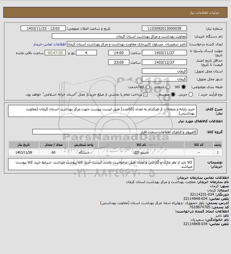 شرح کلی نیاز: خرید رایانه و متعلقات از هرکدام به تعداد (60عدد) طبق لیست پیوست جهت مرکز بهداشت استان کرمان (معاونت بهداشتی)