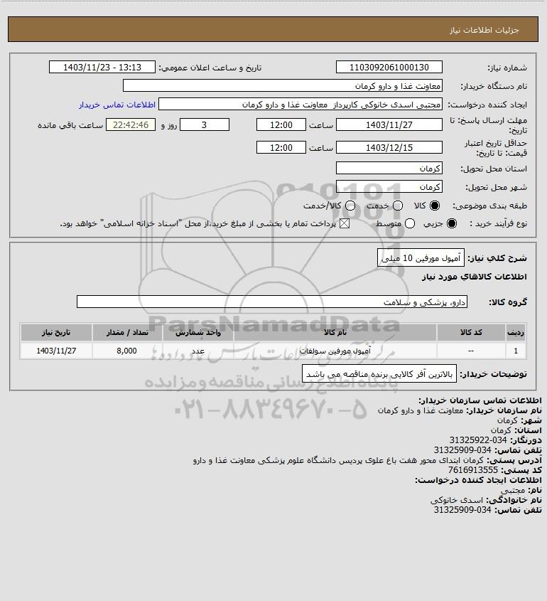 شرح کلی نیاز: آمپول مورفین 10 میلی