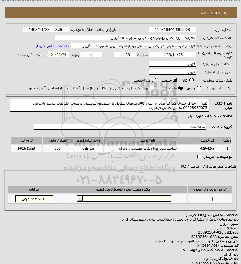 شرح کلی نیاز: تهیه و اجرای جدول گذاری معابر به متراژ 600مترطول مطابق با استعلام پیوستی درصورت اطلاعات بیشتر باشماره 09228925073 تماس حاصل فرمایید.