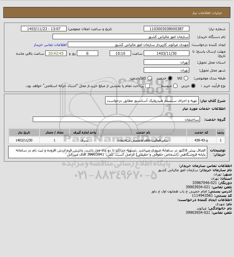 شرح کلی نیاز: تهیه و اجرای سیستم هیدرولیک آسانسور مطابق درخواست