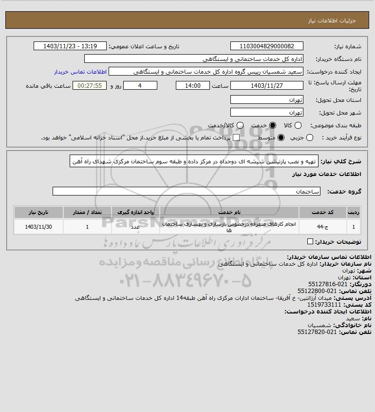 شرح کلی نیاز: تهیه و نصب پارتیشن شیشه ای دوجداه در مرکز داده و طبقه سوم ساختمان مرکزی شهدای راه آهن