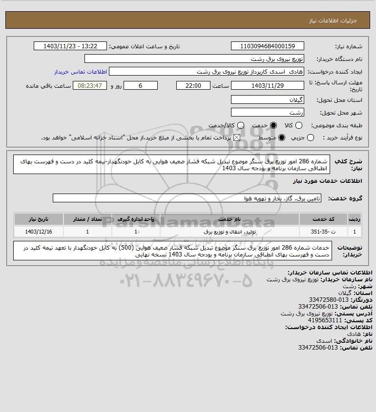 شرح کلی نیاز: شماره 286 امور توزیع برق سنگر موضوع تبدیل شبکه فشار ضعیف هوایی به کابل خودنگهدار-نیمه کلید در دست و فهرست بهای انطباقی سازمان برنامه و بودجه سال 1403