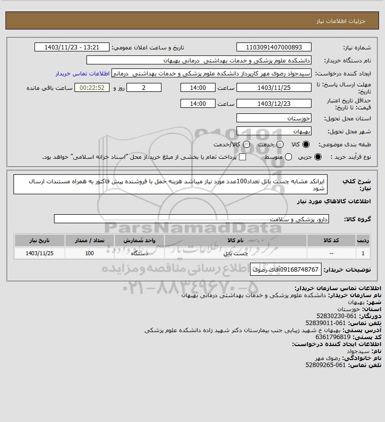 شرح کلی نیاز: ایرانکد مشابه چست باتل تعداد100عدد مورد نیاز میباشد هزینه حمل با فروشنده پیش فاکتور به همراه مستندات ارسال شود