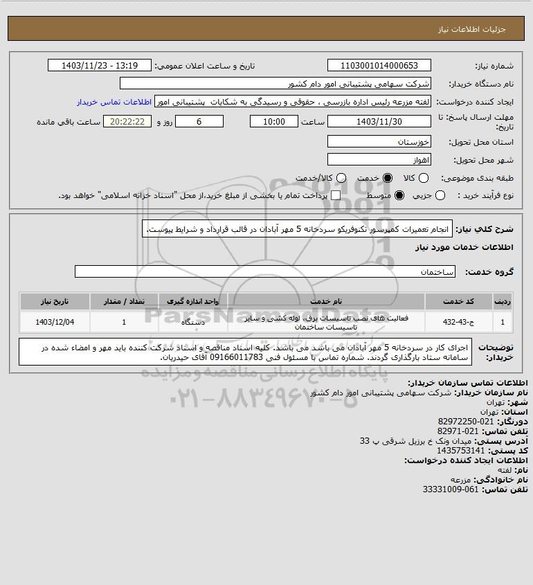 شرح کلی نیاز: انجام تعمیرات کمپرسور تکنوفریکو سردخانه 5 مهر آبادان در قالب قرارداد و شرایط پیوست.