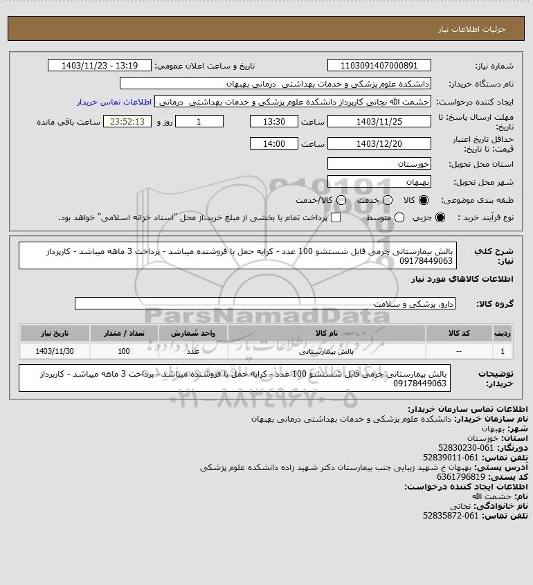 | 1 | -- | بالش بیمارستانی | عدد | 100 | 1403/11/30 |