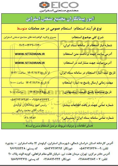 شرح کلی موضوع استعلام: ممیزی و تایید گواهینامه های مجتمع صنعتی اسفراین