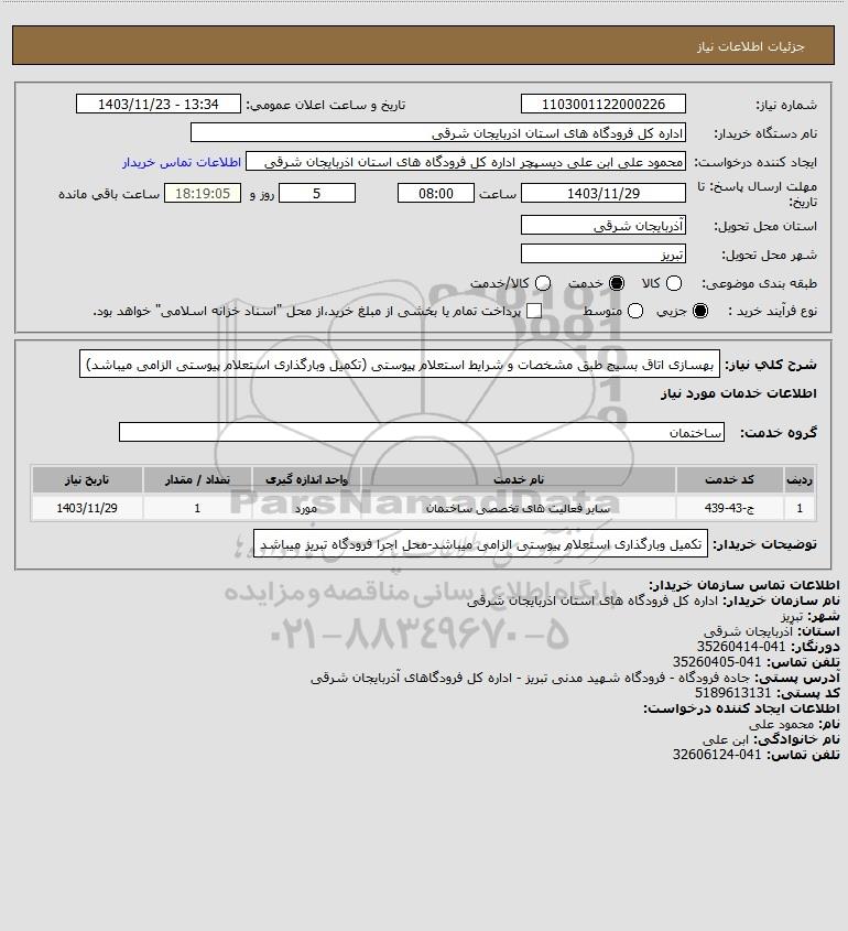 توضیحات خریدار:تکمیل وبارگذاری استعلام پیوستی الزامی میباشد-محل اجرا فرودگاه تبریز میباشد